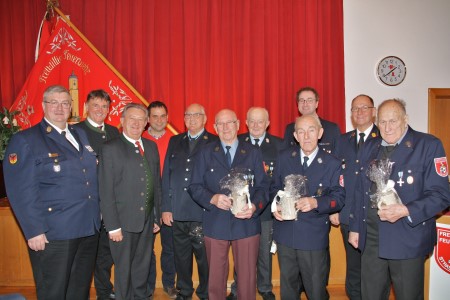 Die ältesten Teilnehmer Martin Resch (5.v.li.), Max Giermindl (6.v.li.), Otto Spitzenberger (7.v.li.), Stefan Giermindl (8.v.li.) und Josef Wagner (re.) wurden von v.li. KBI Alois Fischl, Bürgermeister Josef Putz, Landrat Franz Meyer, Vizelandrat Raimund Kneidinger sowie von Pfarrer Alexander Aulinger (3.v.re.) und KBR Josef Ascher (2.v.re.) geehrt. (Fotos Heisl)