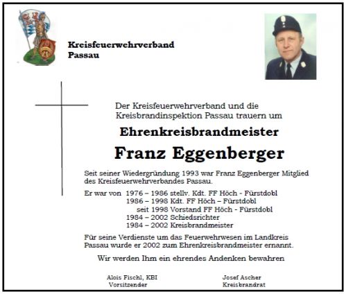 Der Kreisfeuerwehrverband und die Kreisbrandinspektion Passau trauern um Ehrenkreisbrandmeister Franz Eggenberger