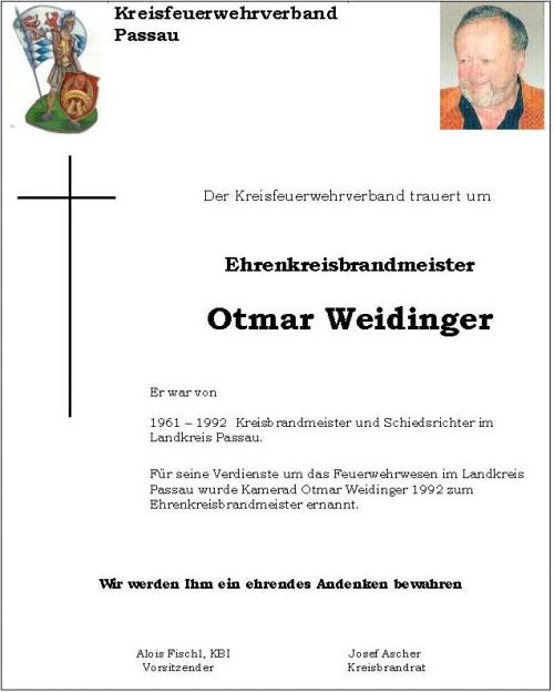 Der Kreisfeuerwehrverband Passau trauert um Ehrenkreisbrandmeister Otmar Weidinger
