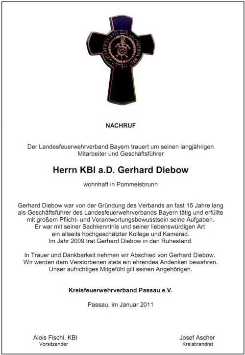 Der Landesfeuerwehrverband Bayern trauert um Herrn KBI a.D. Gerhard Diebow